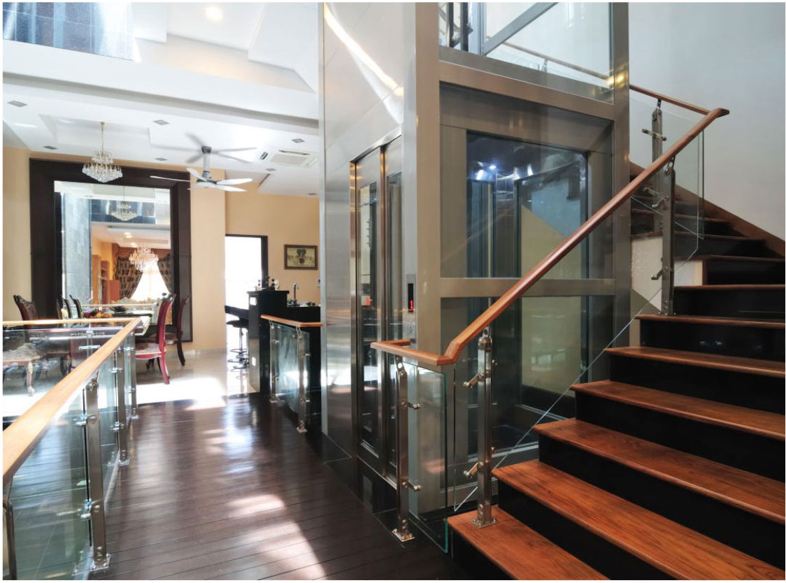 正確定義是家用電梯,住戶任意穿梭于家居,盡顯王者尊貴主人獨(dú)享的家 居方便性。轎廂裝潢十分華麗,轎廂后側(cè)一整塊鏡面不銹鋼板,通過燈光映射,令轎廂更加寬闊豪華。